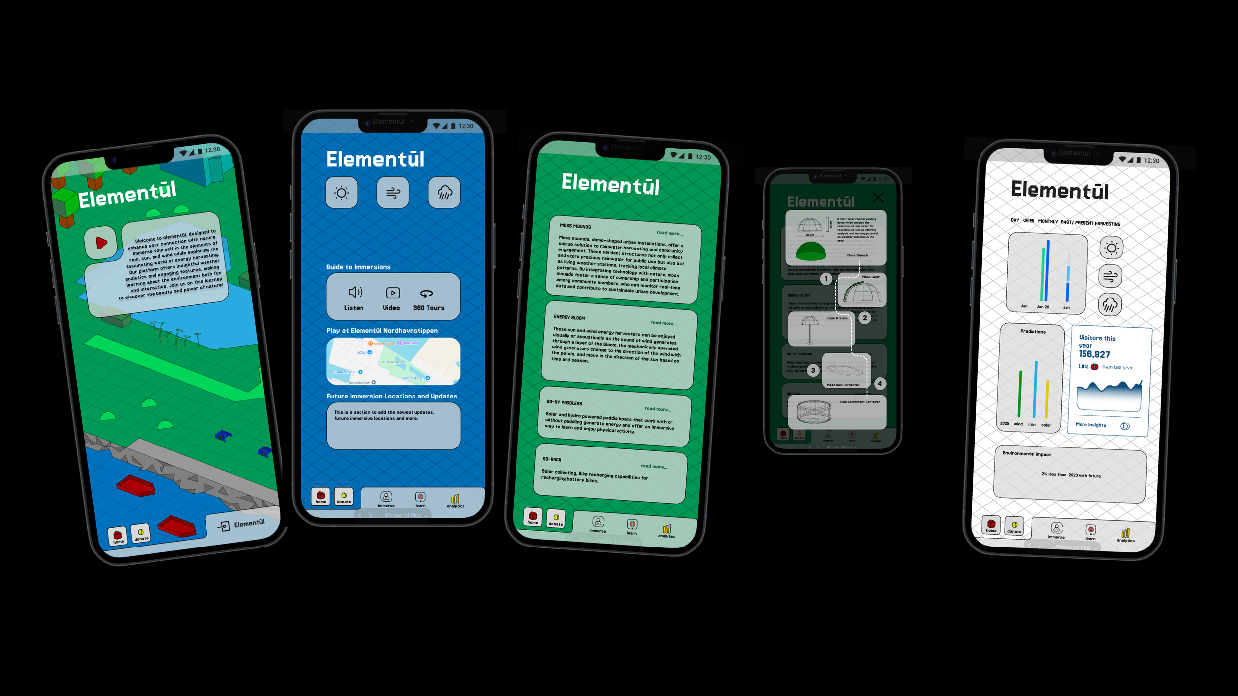Elementul is a combination of a digital app and a physical, energy-generating park located in Copenhagen. The project aims to address the city's increasing rainfall and flooding issues by integrating smart, responsive infrastructure. The app will analyze real-time and historical weather data (sun, rain, wind, etc.) to inform the park's design, which will dynamically shift its energy collection methods.